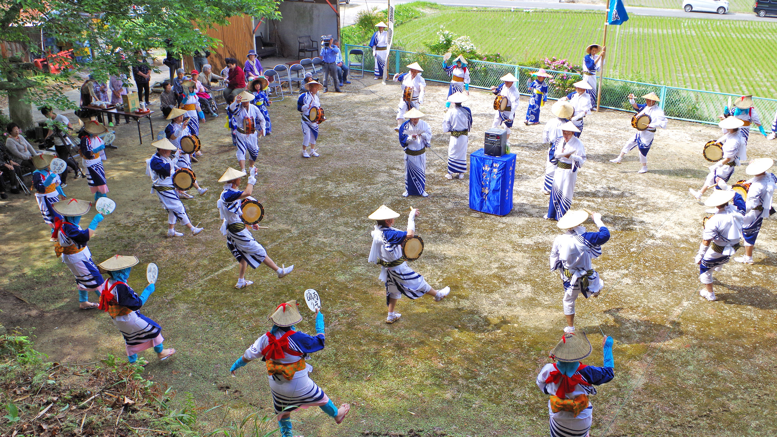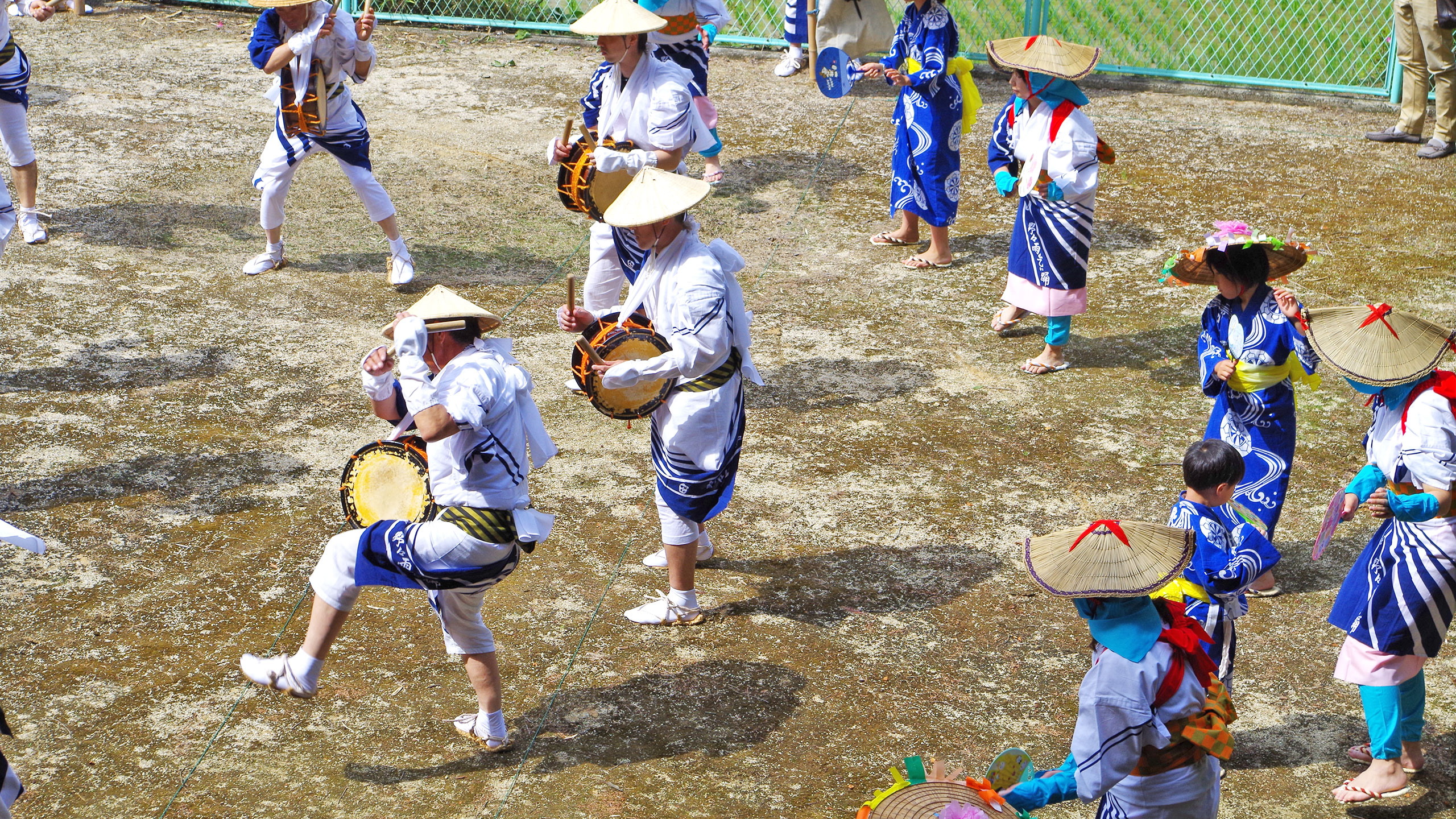 “Tanono Amagoi Odori” in the Tanono district of Gogo, Onohara-cho, is another dance that was introduced by Satsuma priests 400 years ago during the Keicho era. It is a simple dance in which a singer called “Keigo” leads a circle of drummers wearing yukata (light cotton kimono), white tasuki, hand helmets, and leg bands, children wearing hanagasa (hats with hats), and adults in braided hats, all dancing to the accompaniment of songs.