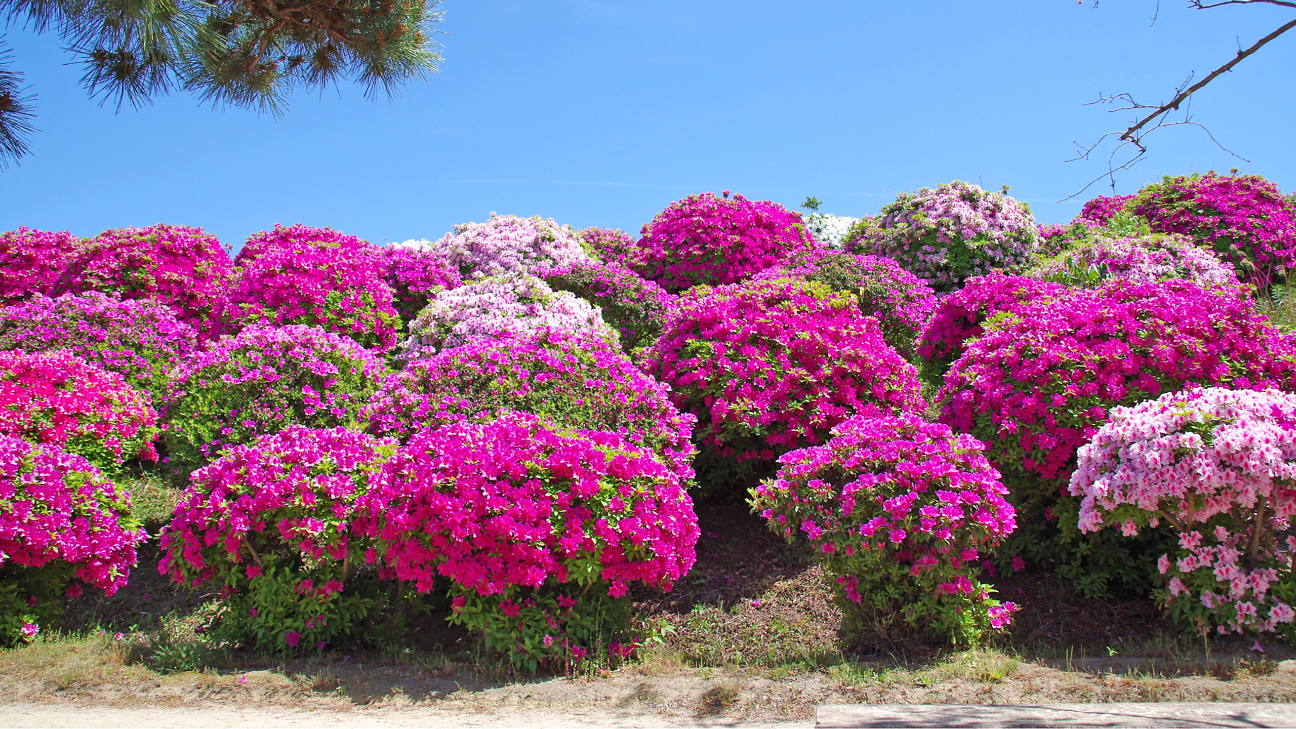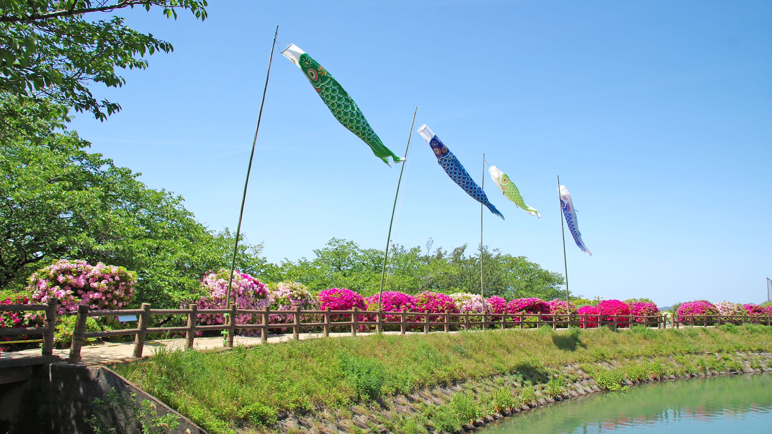 Vivid red, white, and pink azaleas can be seen on the bank of Mitani Pond in Kannonji City Sports Park. About 440 large azalea plants are planted on the embankment of Mitani Pond, and they are usually at their best from mid-April. In preparation for the annual “Rhododendron Festival,” carp streamers will be hung until Children’s Day, and the azalea and carp streamers will compete with each other to the delight of visitors strolling by.