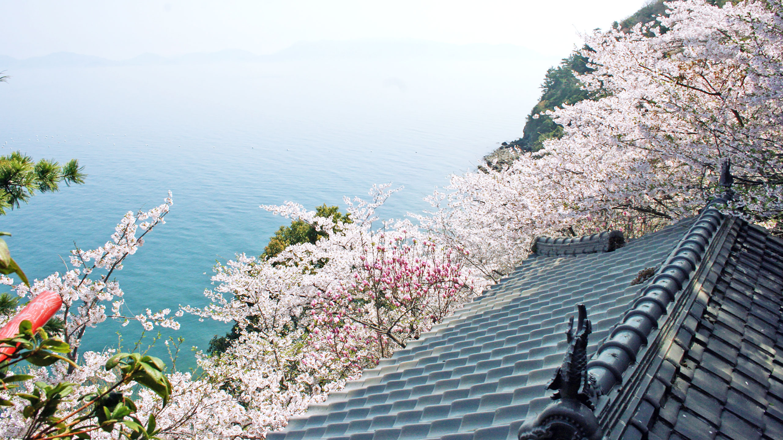The arch of cherry trees planted along the road from Takinomiya Shrine to Namikiri Fudoson is beautiful, and the leisurely view of cherry blossoms on the hillside, which looks like a mountain village, changes as you walk down the slope, with the Seto Inland Sea in the background, and you will never get tired of the scenery.