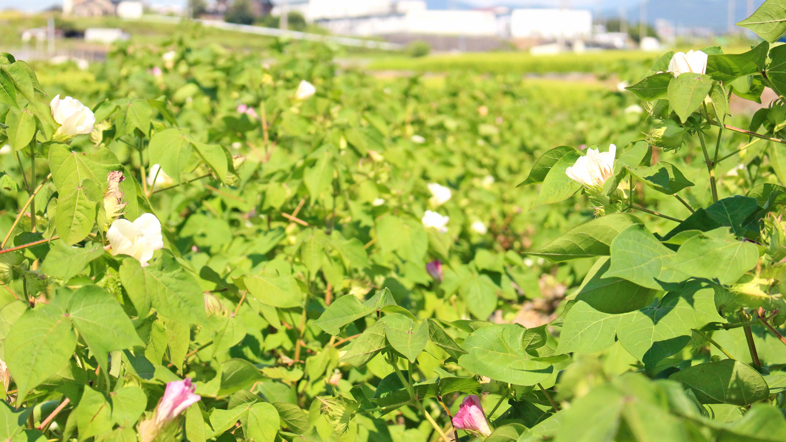 Wata is one of the three whites of Sanuki, and was actively cultivated until around the beginning of the Meiji period. Even today, one can find lovely wata flowers in the fields of the Wadamichimizo district of Toyohama Town. Wata blooms from July to August, and the blue berries grow large in about 50 to 60 days, eventually bursting into cotton around October. Please take a look at the flowers of wata, which are rarely seen anymore.