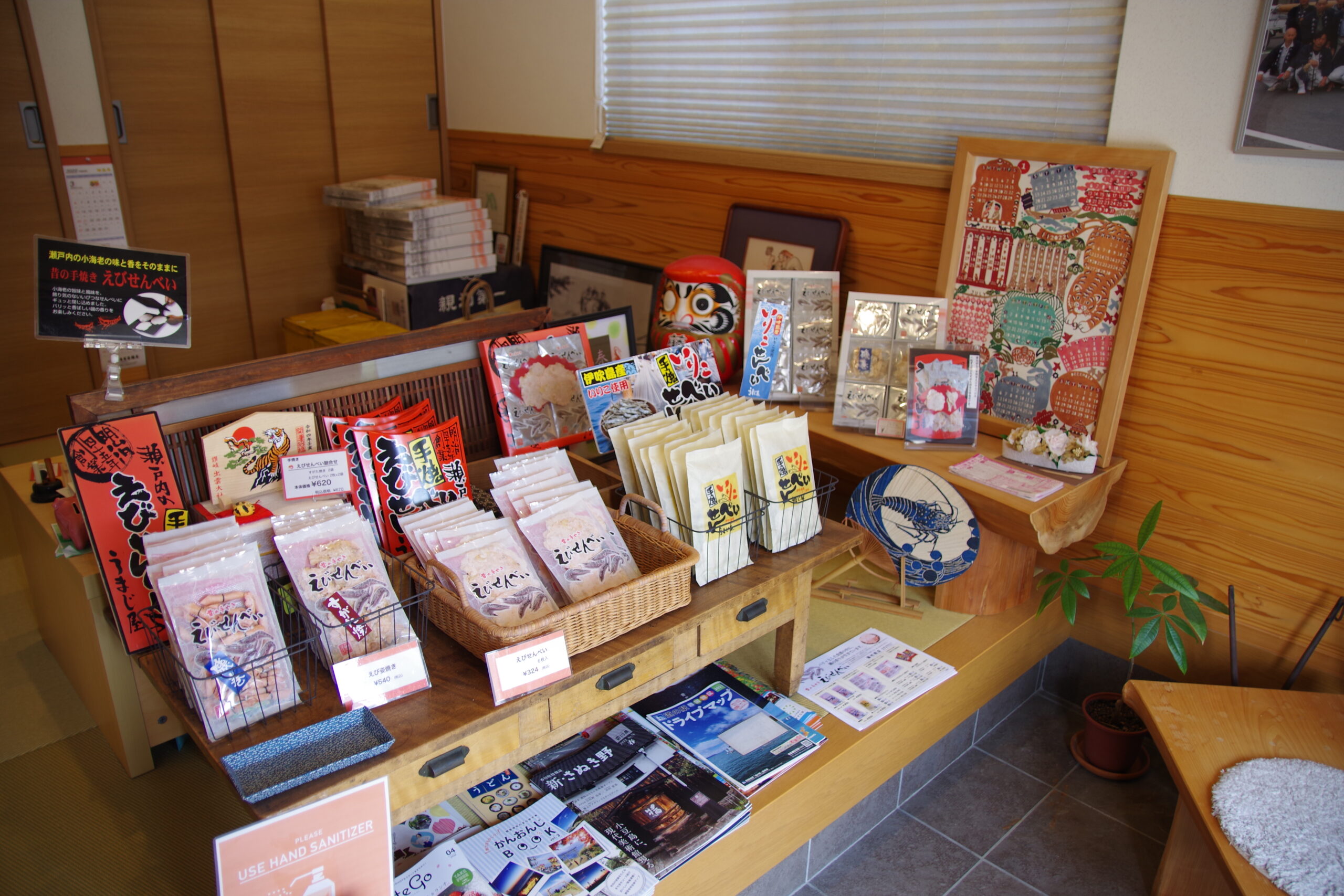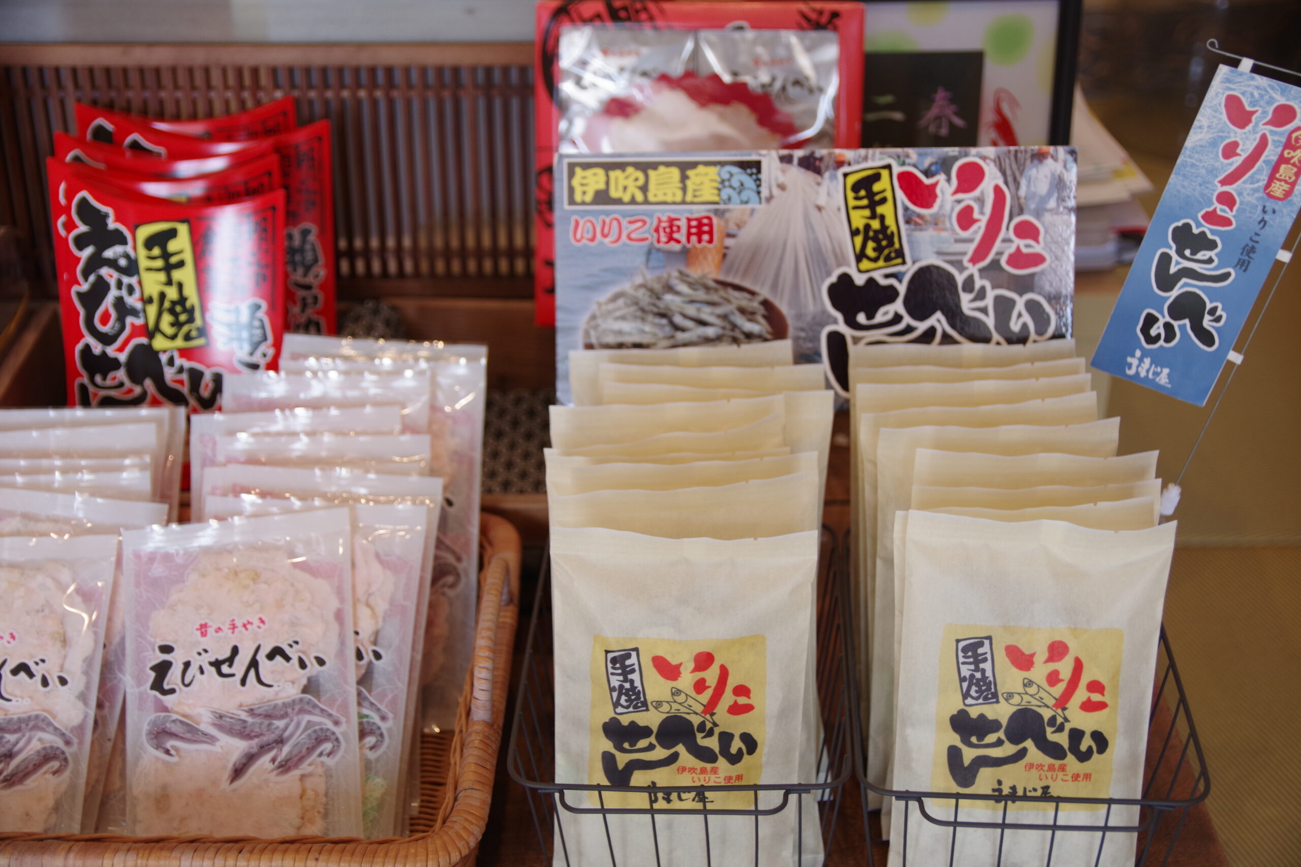 The shrimp crackers are thin and snarly without any decoration. When you gently bite into it, you will feel the crispy texture and the flavor of shrimp from the Seto Inland Sea will spread in your mouth. “Iriko senbei” made from Ibuki iriko are also popular.