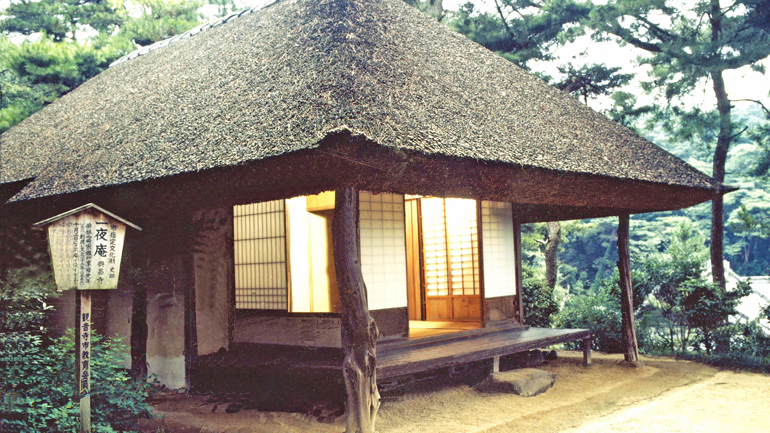 俳諧の祖、山崎宗鑑(やまざき そうかん)が興昌寺の境内に結んだ庵で日本最古の俳跡といわれています。建立は享禄元年(1528)で、その後4回ほど修復されましたがほぼ原形をとどめていて、一夜庵の屋根には宗鑑の生誕地琵琶湖の葦が一部使われています。「一夜庵(いちやあん)」の名は、宗鑑が来客の一夜以上の滞在を好まなかったという次の句「上は立ち 中は日ぐらし 下は夜まで 一夜泊りは 下々の下の客」にも由来しています。