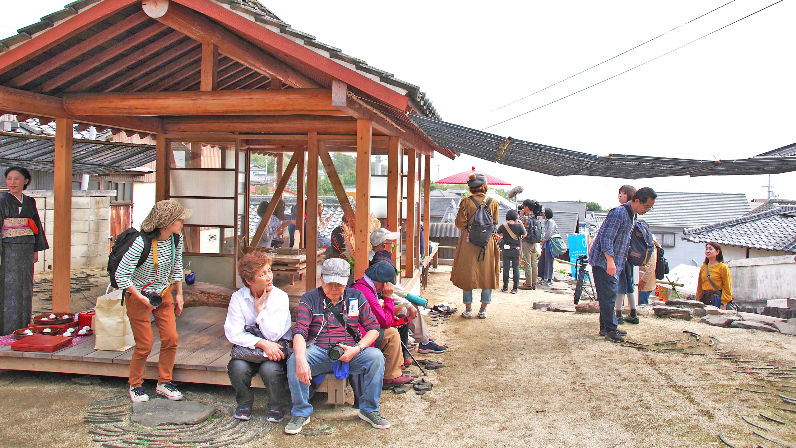 Iriko An (Iriko Hermitage) was exhibited at the 2016 Setouchi International Art Festival by the architect group “Mikangumi” and students from Meiji University. It was created using the seiro, stone walls, and lumber used for iriko processing on Ibukijima Island, which thrives on anchovy fishing, and is still used by the islanders as a place for socializing. During the Setouchi Art Festival, tea was also served at the iriko hermitage.