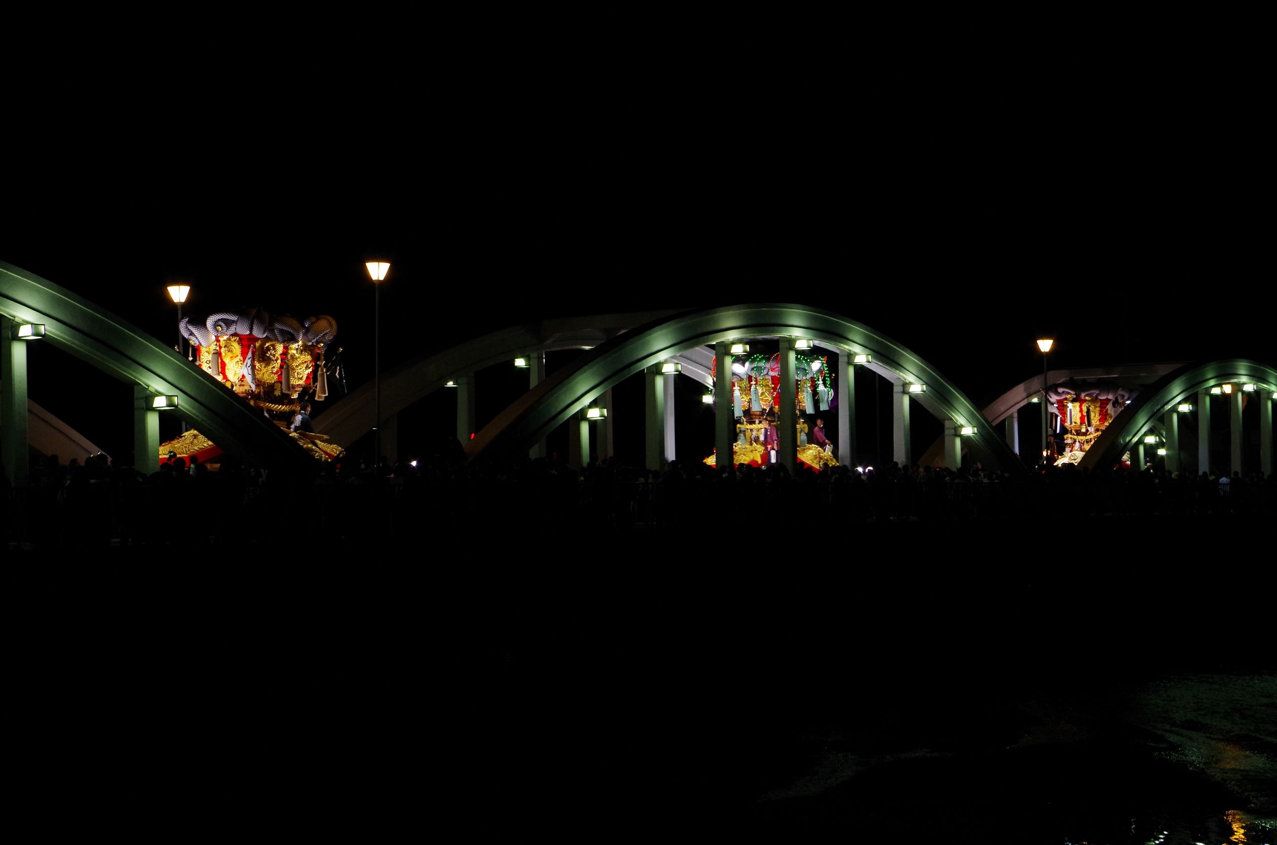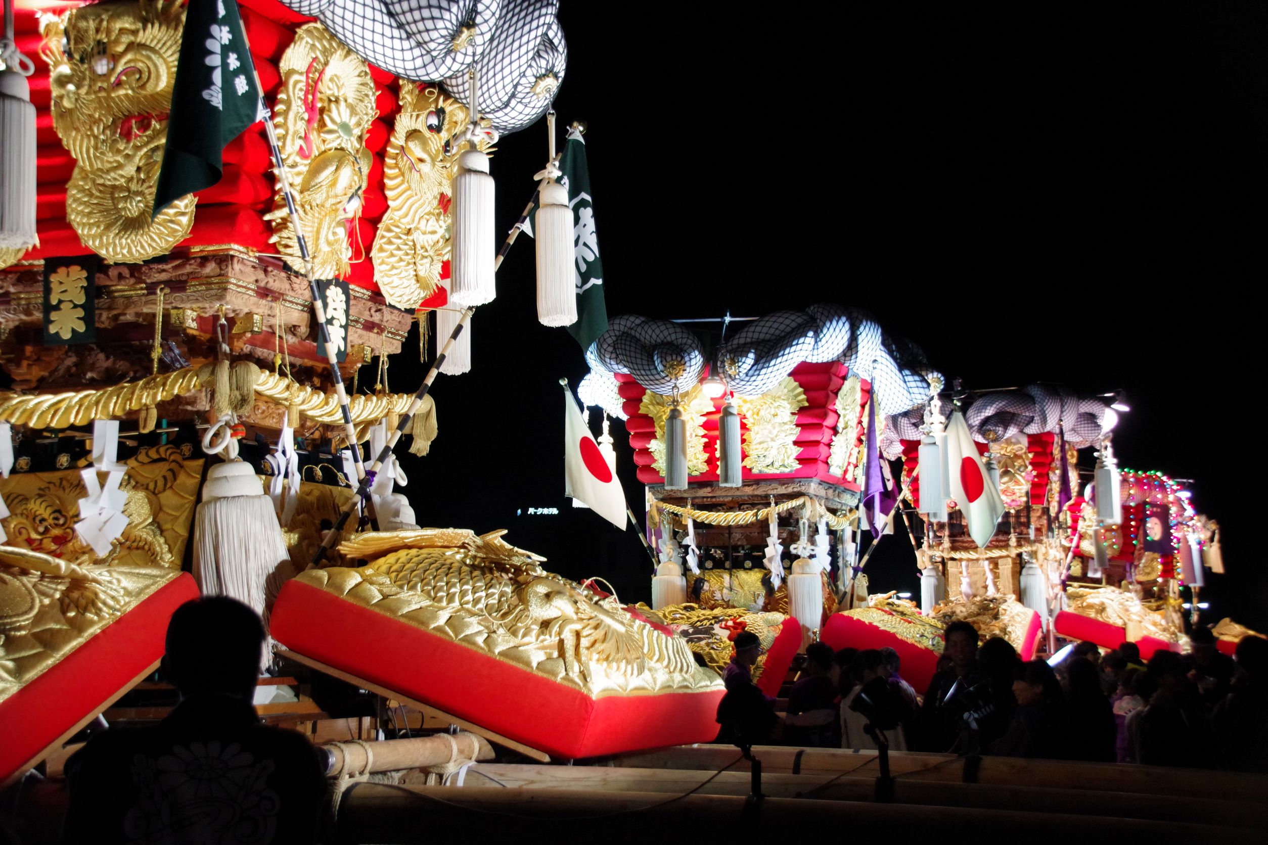 The Kannonji Festival is held for three days, ending on the third Sunday of each year. Friday is called Yoimatsuri (evening festival), during which chosa (floats) are paraded through each district. On Saturday and Sunday, the festival begins in the afternoon and the chosa are dedicated. The dedication of the chosa has been a tradition since the Edo period (1603-1867), and is still carried out according to detailed regulations even today. On the day of the festival, the area around Kotohiki Hachiman Shrine’s Shinkouden is lined with food stalls, attracting many people. The fireworks display on Saturday night is one of the highlights of the festival every year.