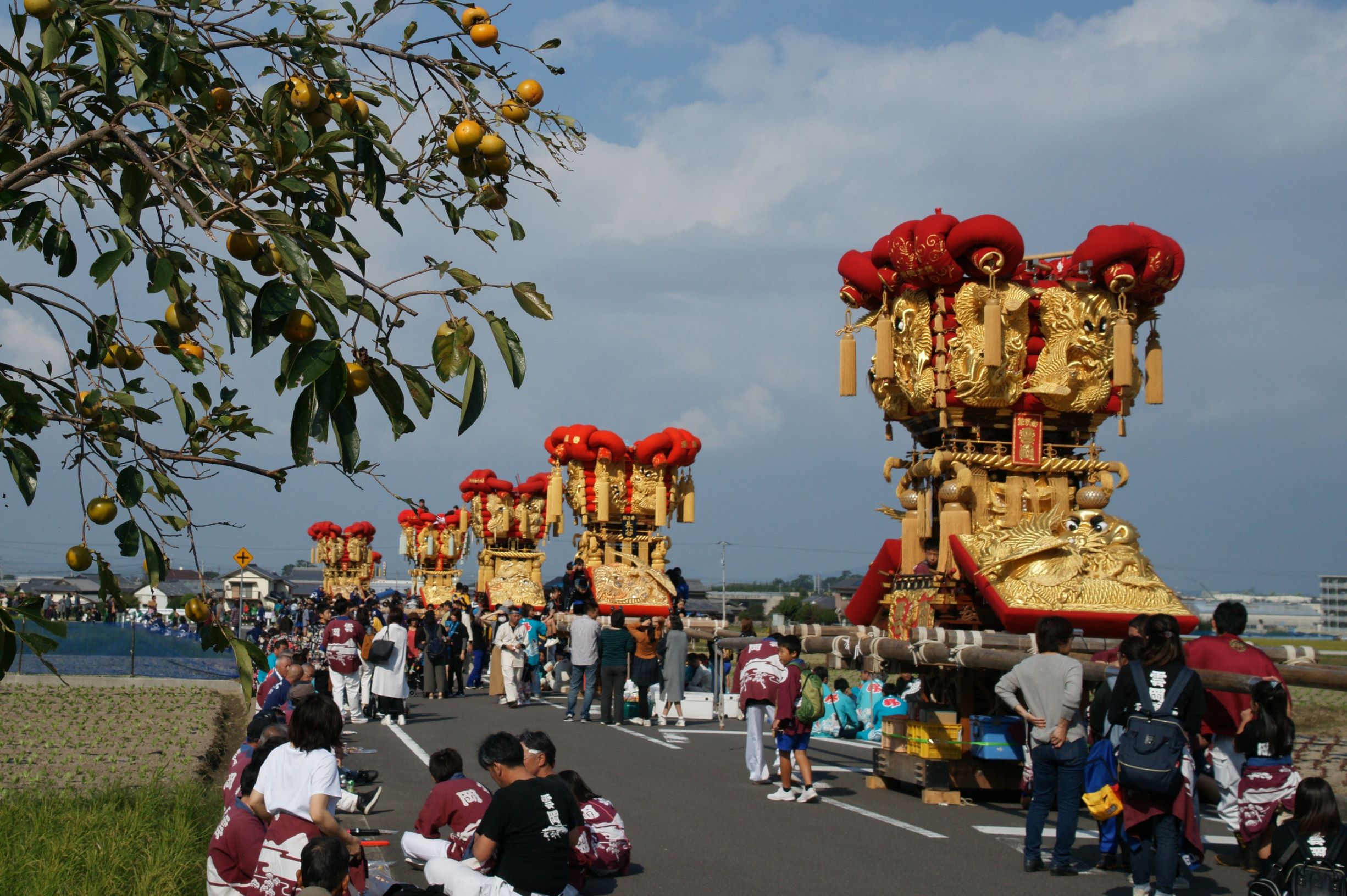 The parade of the Chosa, richly decorated with gold thread embroidery, is a spectacular sight to behold as the bearers, dressed in happi coats, parade through the district, competing with each other at the Otabisho and the plaza.
