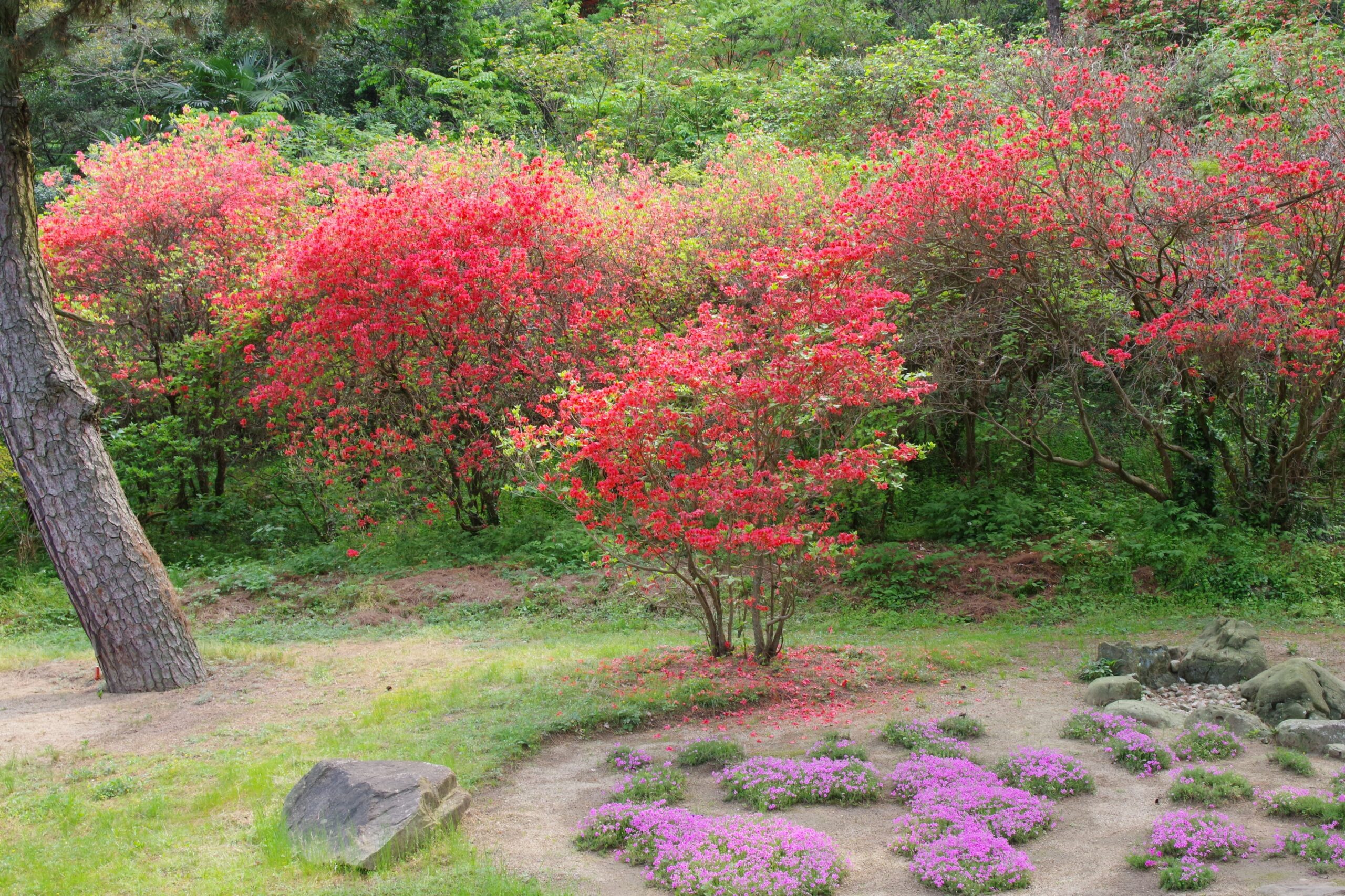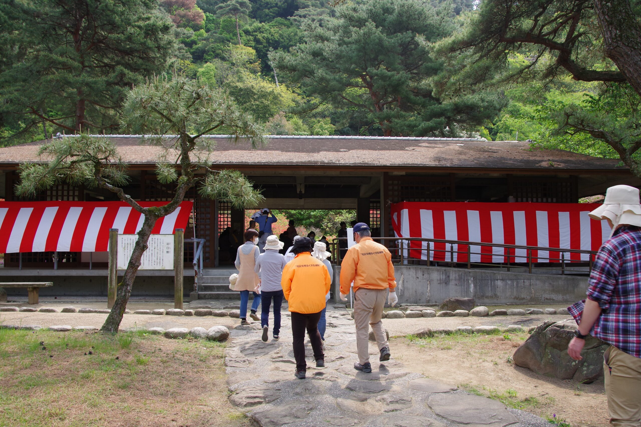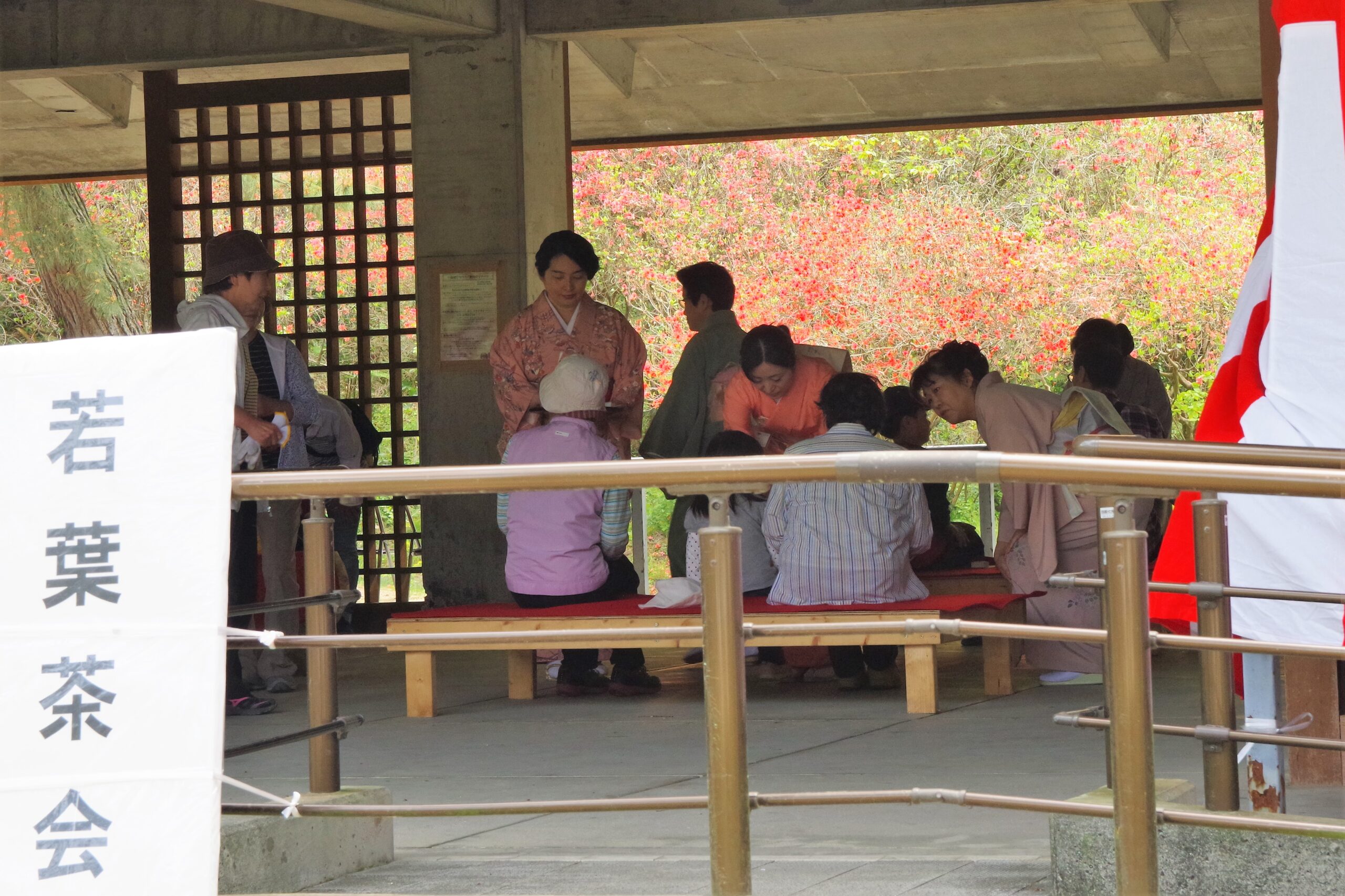 Every year, the Wakaba Tea Ceremony is held by the Tourist Association in conjunction with the spring sunazarae (makeover) of the “Kan’ei Tsuho” senigata sand painting, which has become an annual event at Kotodama Park. There is a suikinkutsu in the backyard, where visitors can enjoy the metallic and unique echoing sound similar to that of the koto. Why not enjoy green tea surrounded by fresh green pine trees and maple trees, with the suikinkutsu and mountain azaleas in full bloom in the background?